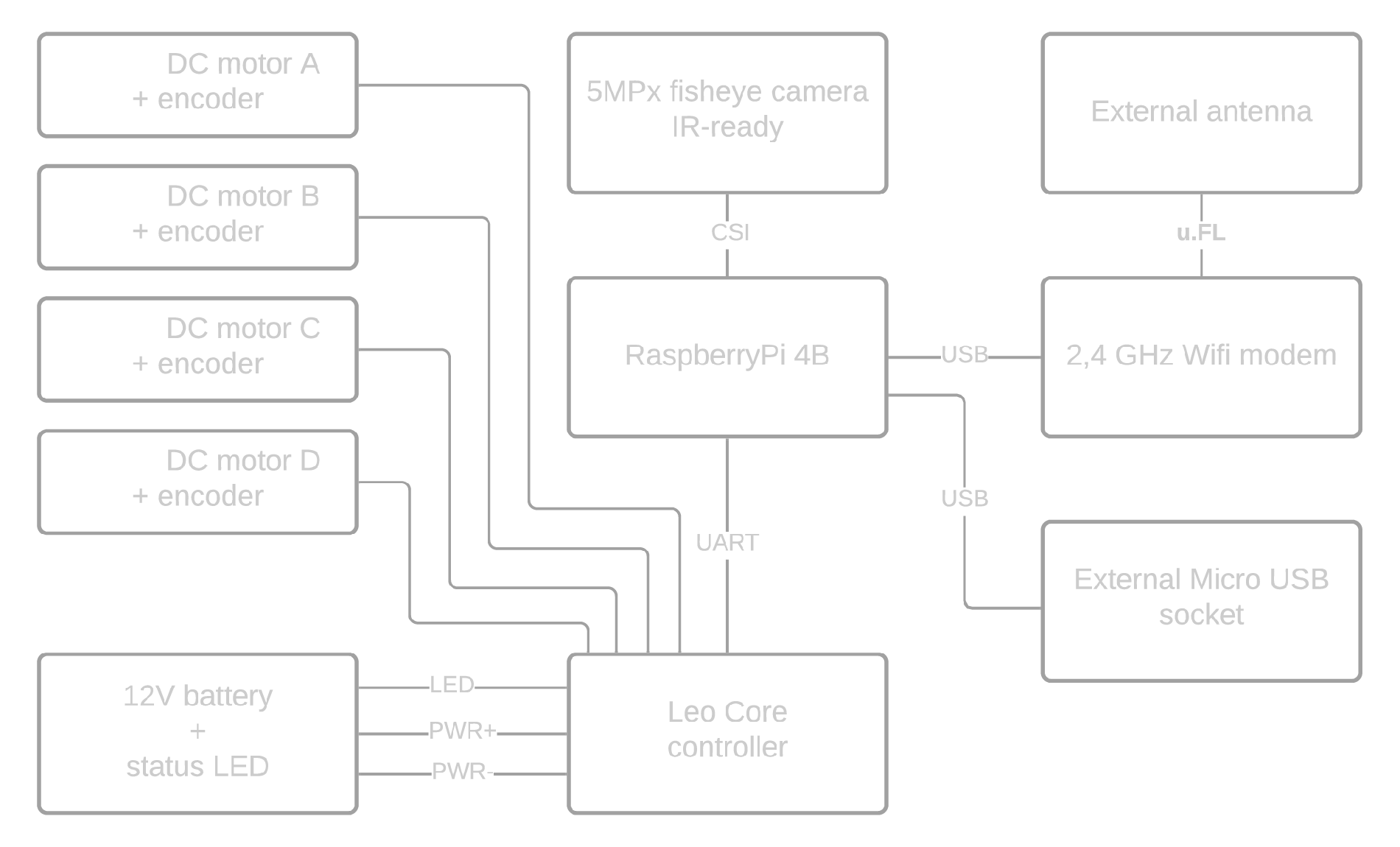 - Provides power and serial communication between LeoCore and Raspberry Pi